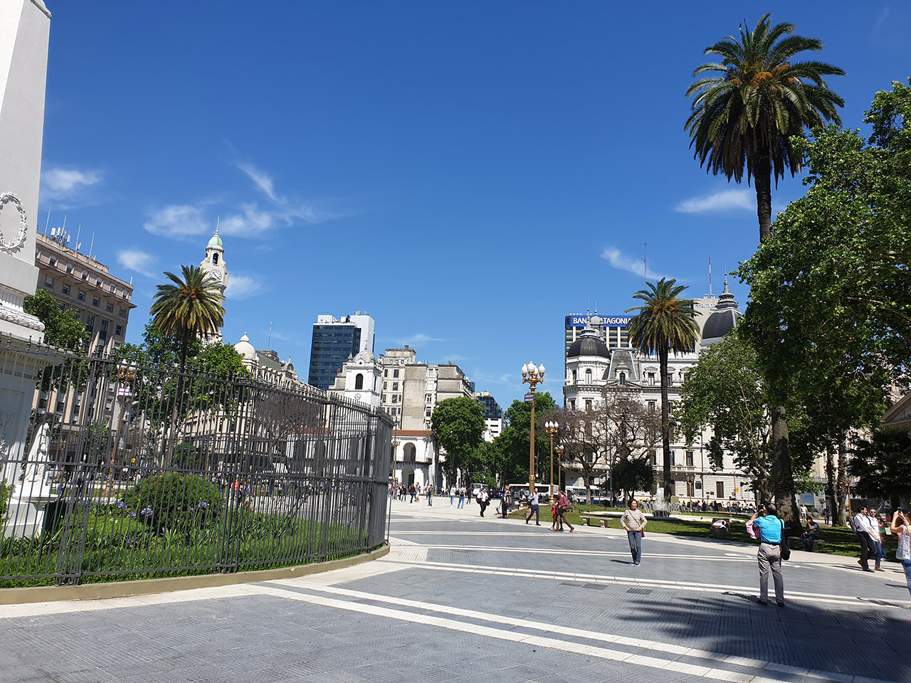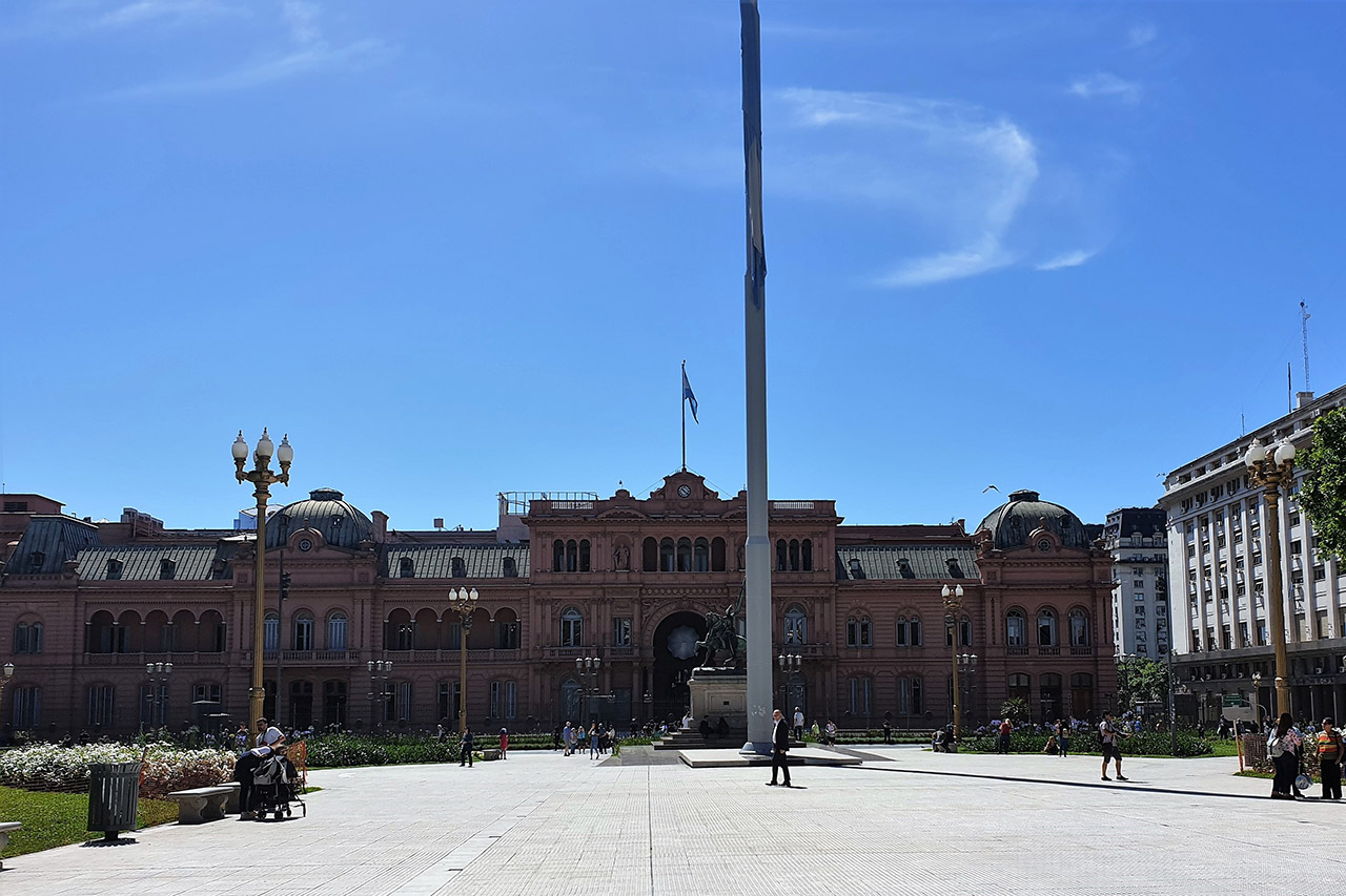 Unsere nächste Station ist der Plaza de Mayo („Platz des Mais/der Mairevolution“) – das Herz der argentinischen Hauptstadt. Der Platz ist rechteckig und als Park angelegt. An ihm befinden sich die Kathedrale von Buenos Aires, die Banco de la Nación, der Cabildo (ehemals ein Regierungsgebäude, heute ein Museum) und die Casa Rosada an der Ostseite – der Palast des Präsidenten von Argentinien. „Rosada“ deshalb, weil die Außenfarbe in entsprechendem Licht in einem kräftigen Rosaton leuchtet.