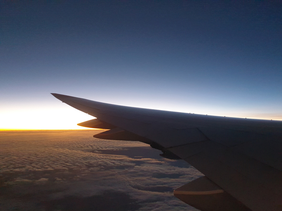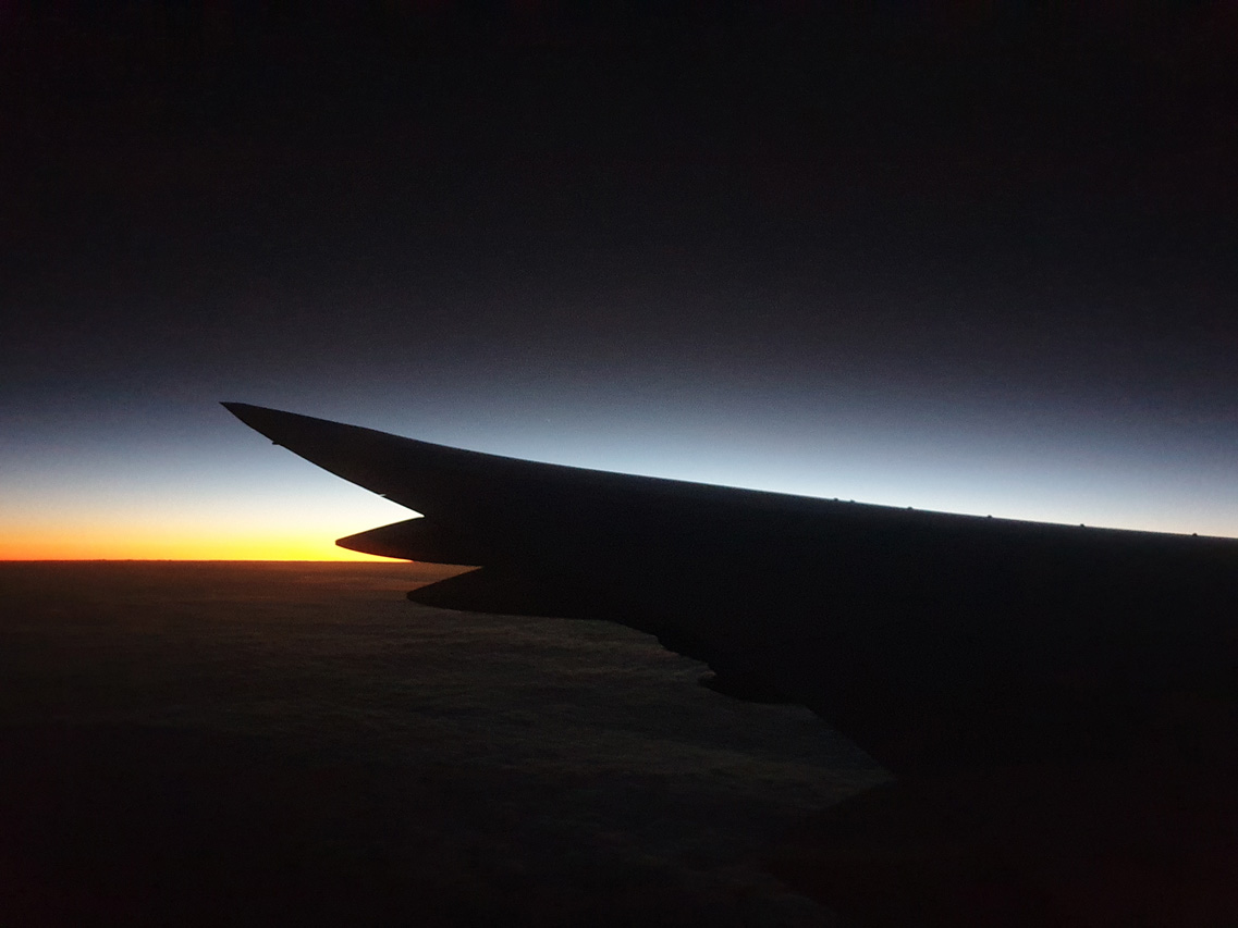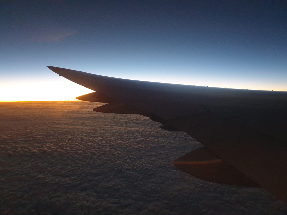 Der Passagier vor mir ist gewaltig. Bud Spencer hätte sich hinter ihm verstecken können. Er lehnt sich zurück und seine Rücklehne ist noch max. 10 cm von meinem Gesicht entfernt. Wie soll ich das 14 Stunden aushalten? Eine Lösung gibt es nicht, denn die Maschine ist ausgebucht. Also Zähne zusammenbeißen und aushalten. Essen ist unter den geschilderten Umständen auch relativ schwierig, aber irgendwie bekomme ich auch das geregelt. Gegen 23 Uhr wird das Licht gedimmt und so langsam kehrt in der Sardinenbüchse Ruhe ein.